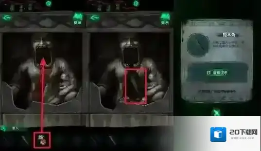 敲碎瓷砖后,选择道具栏中的面人放入瓷砖后雕像的嘴里,拾取短木条。