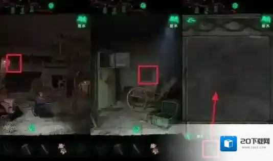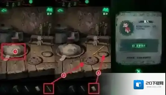 进入门神房间后,先拾取靠在床铺上的晾衣杆,然后往左侧看,有一个灶台和一个风箱,这里需要先点灶台,在道具栏选择火柴点燃灶台,然后返回再点击灶台旁边的风箱,按照之前在小卖部窗口用手机看到的提示拉动风箱,看地上有白色粉笔画的标记,分别代表一、二、三,长按风箱把手,拖动到对应的标记位置后松手,视为拉动了一下,依次将风箱把手拉到一、三、二、一的位置,让火生的更旺。