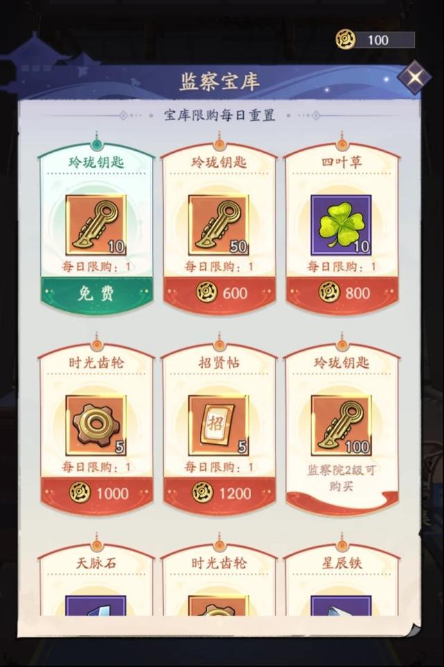 监察宝库:人人都爱的“0”元购小卖部,各位大人每天都可以使用在其他监察院玩法获得的监察币,来进行物品的购买。监察院等级越高,可购买的物品种类越多,游戏所需的资源基本都能在这买到。