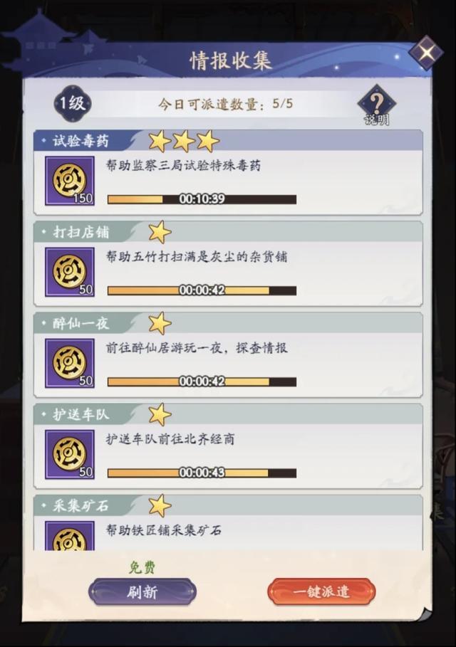 情报收集:即资源派遣玩法,0成本高回报。大家可以在这里接受各种星级的情报任务,接取任务后经过一定的任务时间就能完成任务获取奖励。完成特定星级要求的任务后还可以提升情报等级,获得高星级任务的概率提升。