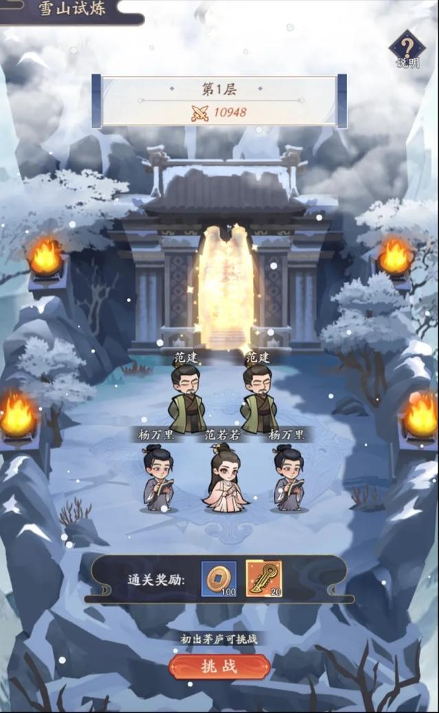 开服第3天开启,是游戏内重要的组队爬塔玩法。队伍由3位玩家组成,每位玩家分别出战1名主角与1名伙伴,由队长操作进行关卡挑战,首次通过关卡后即可获得对应的奖励,是获取打造暗器所需材料的重要来源。
