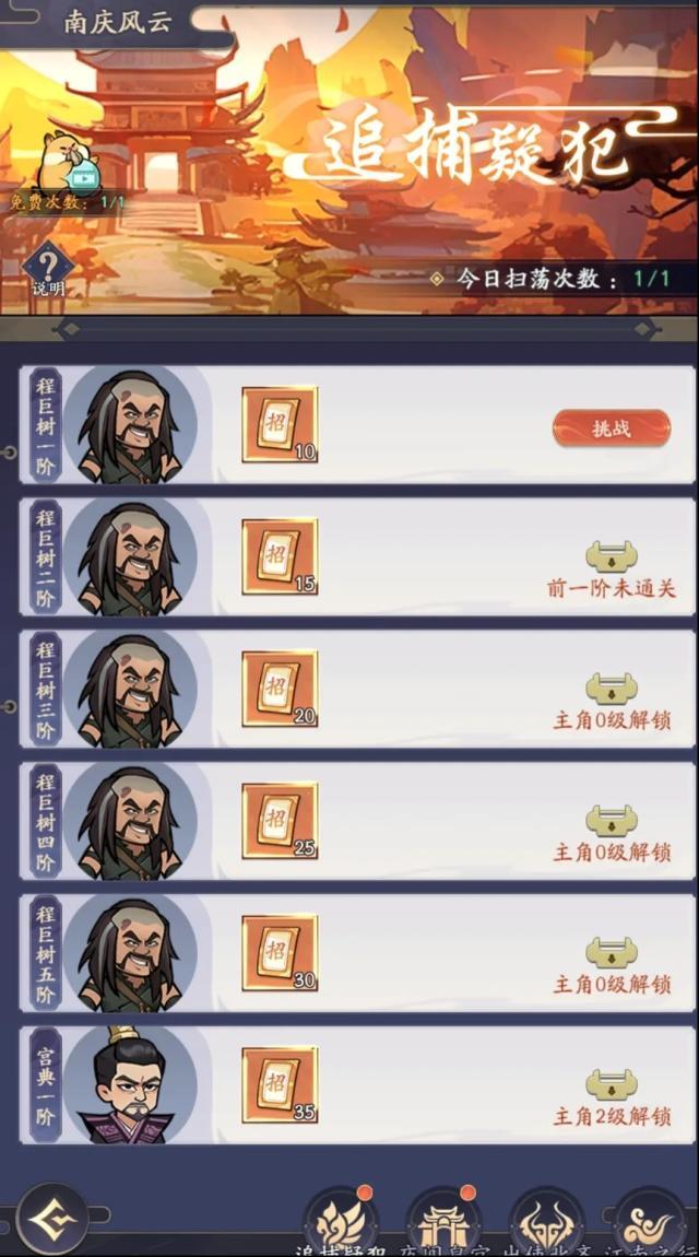 即副本玩法,目前共有追捕疑犯、夜闯皇宫、出使北齐、江南之行4种副本,随着等级逐渐解锁。通过挑战副本关卡即可获得对应挑战奖励:追捕疑犯-招贤贴、夜闯皇宫-玲珑钥匙、出使北齐-洗髓丹、江南之行-星辰铁、火灵晶。