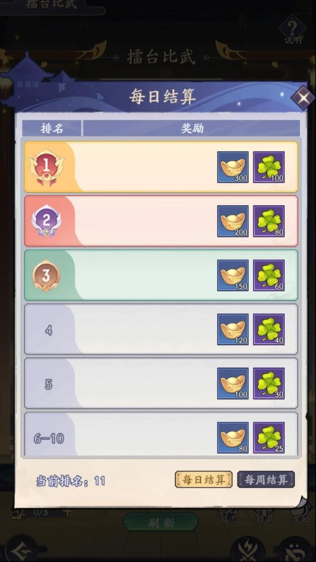 PVP活动,分为本服的擂台比武与跨服的殿前比武。各位大人可以在竞技场中挑战其他玩家,获取竞技场积分提升排名。每天0点结算1次,发放元宝与坐骑升级材料四叶草;每周赛季结算1次,发放元宝与坐骑进阶材料奇异果实。