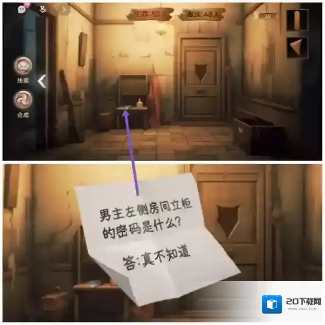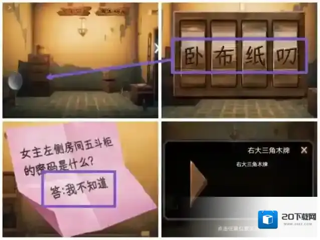 8.点击五斗柜上的密码锁,根据男主那边的线索,输入密码:卧布纸叨;打开柜子,获得右大三角木牌
