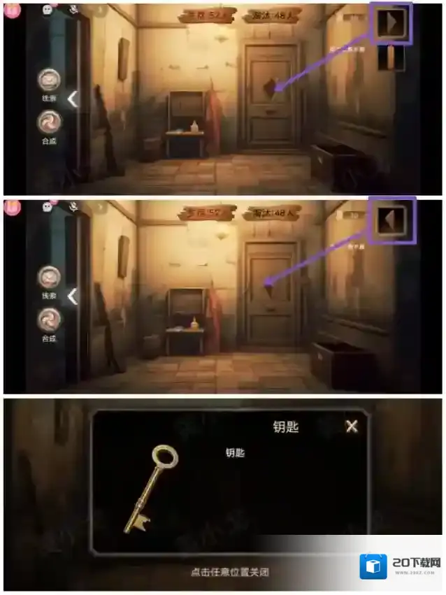 10.把左小三角木牌、右小三角木牌、右大三角木牌和左大三角木牌放到大门拼图上,获得钥匙