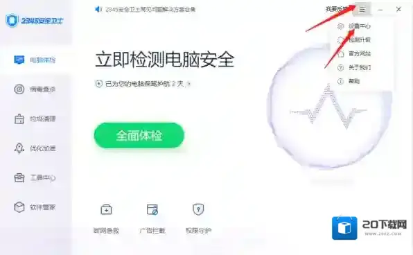 1、在2345安全卫士右上角点击菜单,选择设置中心进入。