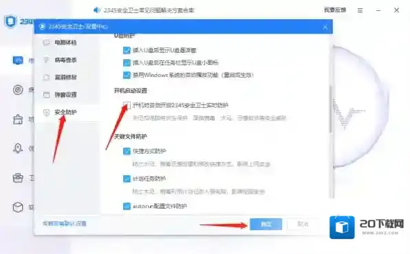 2、进入设置界面后,选择左侧的安全防护,找到开机启动设置,勾选开机时自动启动2345安全卫士实时防护,然后点击确定即可。