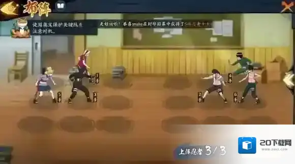 过关方法:分别点选敌方7手小樱本体和6手鸣人本体,释放卡卡西和丁次奥义分别秒之,解决剩余敌人即可。(这关就有很多没搞明白新手教程的人不知道怎么能分别用奥义攻击两个人)
