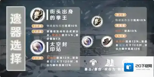 「毁灭」命途开拓者的遗器最优选择为街头出身的拳王四件套加太空封印站二件套,拳王套可以提升开拓者的物理属性伤害并通过叠层大幅提升攻击力,太空套则会直接提升开拓者的攻击力,当开拓者得到队友的速度增益时还会有额外攻击力增益,这两套遗器组合可以简单粗暴的提升开拓者的输出能力。