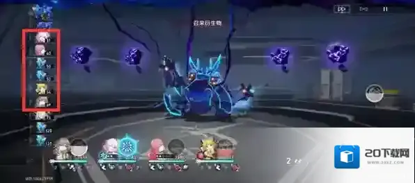吃亏的点就在于红框框住的两个小怪,别看他俩是被召出来的,那平A的减速究极离谱,如果两者同时打到一个角色身上,那么恭喜你,那个角色喜提两回合坐牢权,各打到一个角色,那都是少一回合的出手权。所以这里的选择是破掉这两只小怪的白盾。