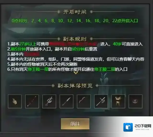 帝王陵副本开启的相关规则开启时间:每天0:10、2、4、6、8、10、12、14、16、18、20、22点开启入口。