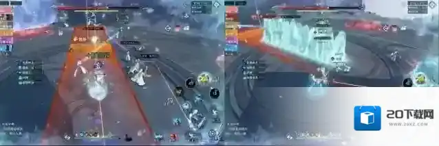 7、流程4:冰崖冲锋,冰狼从一侧的冰崖冲向另一侧,同时所有人脚下生成小红圈。随机两名队友身上生成“蓝”字并连线,相互远离拉断连线即可生成冰墙。冰狼成功冲锋会造成全屏秒杀伤害。
