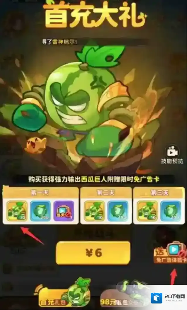 首充带1天的免广告,里面还送1个西瓜巨人,其实西瓜巨人在现在这个版本阶段有没有都能玩,紫卡里面的平民战神。