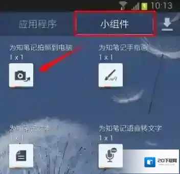 找到手机系统的桌面小组件(也叫 widget),拖动为知笔记 1×1 的,名称为 为知笔记拍照到电脑 的桌面小部件到手机桌面 不同型号 Android 手机调用桌面小部件的方法