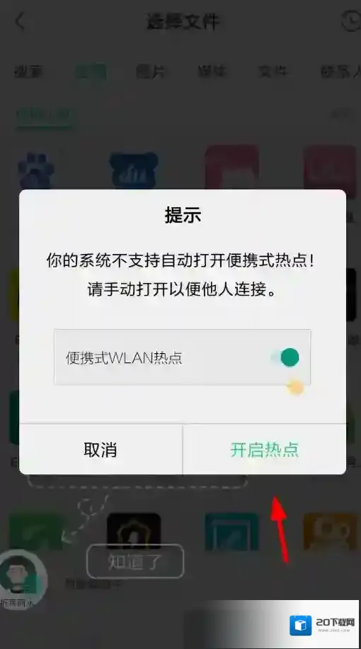 2、接下来进入到选择文件的页面里,大家还需要在手机里面开启便携式热点,这样才能让其他手机进行连接,从而互传文件。