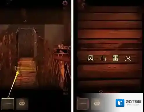 7、我们再把图案木条放进桥面凹槽,滑动木条使其对齐图案,获得线索:风山雷火。