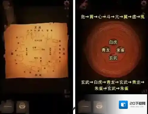 6、接着我们查看吊桥右侧圆盘,用星宿图线索,找到每个星宿名称对应神兽,依次点击即可。