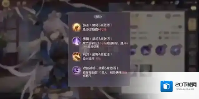 关银屏:爆裂冲击(提高伤害)/破釜沉舟(提高存活及攻击),一般3火前使用破釜沉舟,3火时候两者差不多,5火后爆裂冲击伤害更高,破釜沉舟能多挺一会。