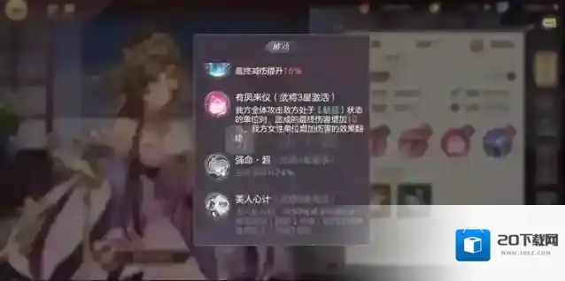 整体拥有+15%对男性防御,+20%免伤,+2回合20%暴击率的buff,同时对被魅惑单位有额外20%的伤害加成。