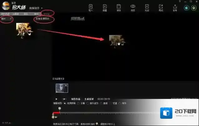 4、同理,我们再在“素材区”找到“图片”,然后点击“添加本地图片”并把我们准备好的图片添加进来,然后也将其拉倒右边的编辑区;
