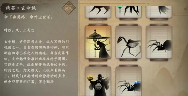 6、玄伞魑:风、土易伤,能阻挡上方技能,但护不住脚。可以冻住它,或者斜着放火攻击脚下。多练几次技巧,掌握了就很好打。