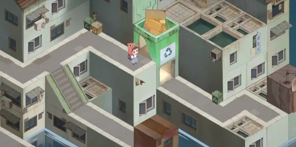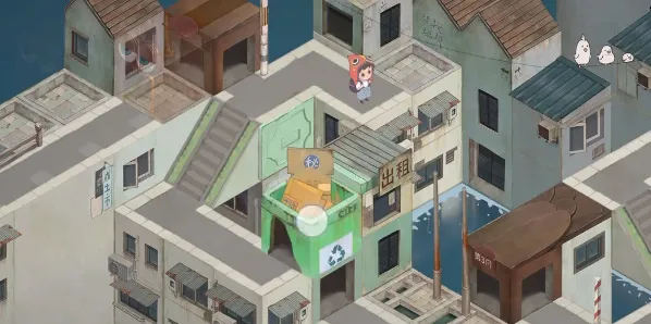 1、玩家过完剧情进入关卡,首先爬上楼梯来到二楼,收集左侧的绿色房子,然后打开背包将绿色房子拖动下图所示的位置。
