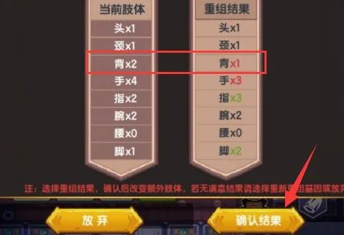 6、如下图,使用基因重组功能后,会随机获取一组或五组肢体方案,遇到五个背部的方案时,点击确认结果就可以应用这套方案,这时玩家就会有五个背部,再加个以太病的一个,就是六个背部了。
