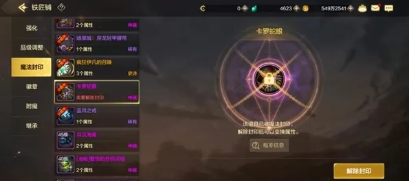 作用介绍30级以上的稀有、神器和史诗装备通过解除魔法封印来获得词条属性。