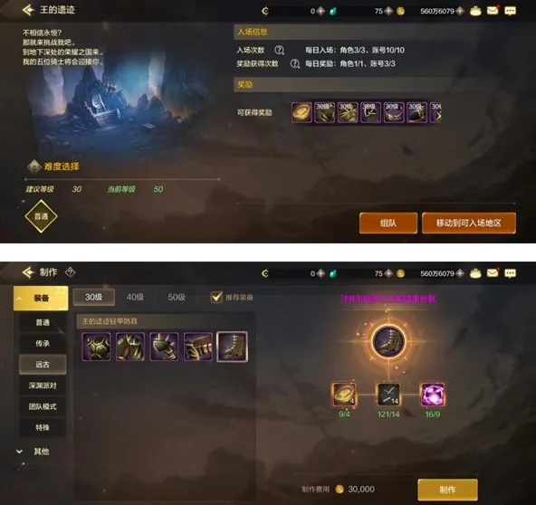 战争之王套装鞋子,产自30级远古地图“王的遗迹”,通关该副本会获得一定量的对应材料,可以在制作系统中制作30级远古装备,并且在40级、50级的时候都可以通过材料对其进行升级,这套装备只有鞋子属性是最好的,只做这一件即可。
