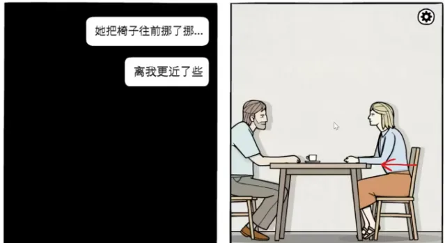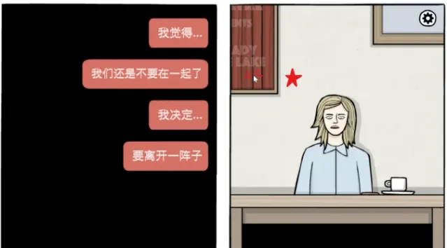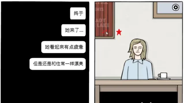 Laura坐在对面,先点击左上角的红色海报,让它亮灯,然后点击Laura。
