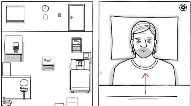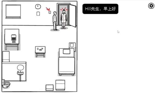 接下来走到门边上的查房按钮处,点击红色按钮。医生进来后,点击医生,使Hill走近和医生对话,会有几个简单的问题需要回答。