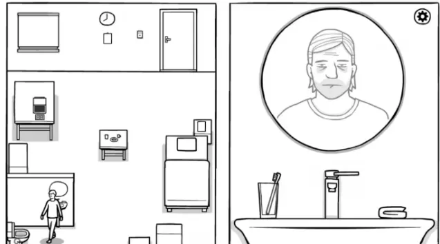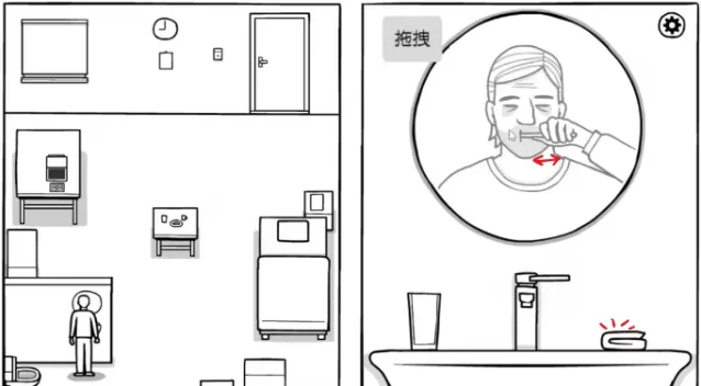 接下来完成洗漱。到墙的背面,点击牙刷,左右来回拖动牙刷;点击毛巾,左右拖动完成擦拭。走到马桶处,点击冲水。