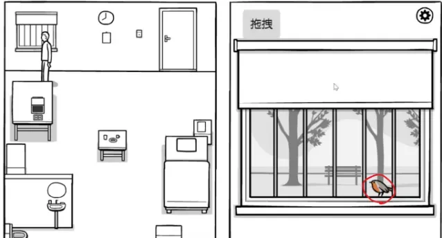 另一边是窗户,上面有一只知更鸟,点一下会飞走。