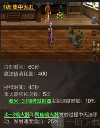 集中火力施放后可以让重火器速度发射速度获得大幅提升,并且能取消重火器的后坐力,在找准连招时机情况下,能用重火器技能组合的连续技对手造成高额伤害。