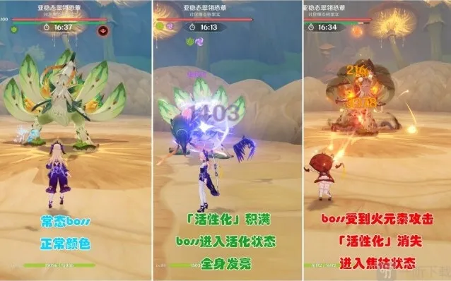 ②活化状态:使用雷属性攻击(激化)使得boss「活性化」积满,进入全身发亮的活化状态,进行活化攻击