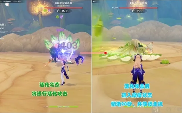 活化攻击后,boss就会进入长达20秒的瘫痪状态,瘫痪状态下,boss全抗进一步降低(第一次降低为破除草元素护盾)