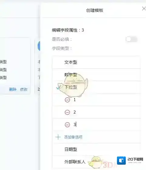 6.例如我选择了下拉型的。我的下拉目录下有三个更小的目录(其实可以把必选项做下拉的选项,以后不用输入,直接在下拉目录里选择更直接。也不会出错。选择好之后保存字段类型就可以了。