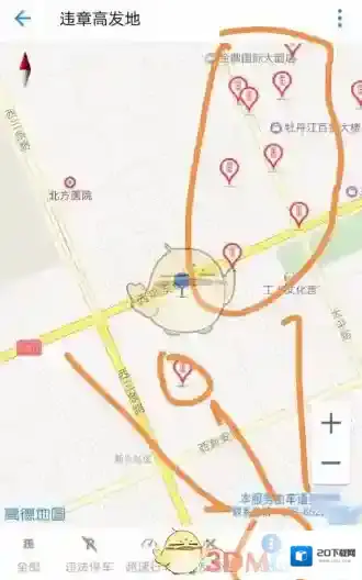 如果想查询那些地点是违章停车的违章高发地需要点按箭头指向的下方的违法停车标志,此时界面中会出现红色的斜杠加字幕P标志,这些标志所在位置就是对应的违停违章高发地,如下图所示。