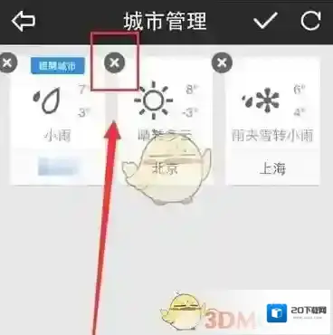 7.如果需要删除某个城市,则在城市管理界面,长按需要删除的城市的图标,等待图标左上角出现“打叉”按钮,点击它进行删除即可。如下图所示。