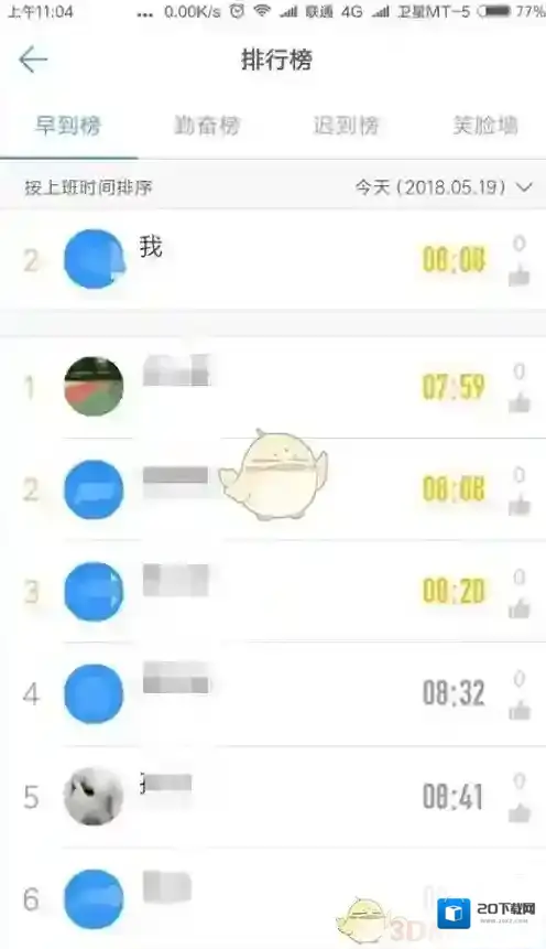 5、点击早到榜,可以看到今天的出勤打卡时间排名。