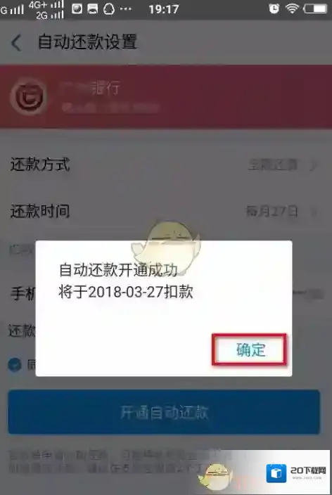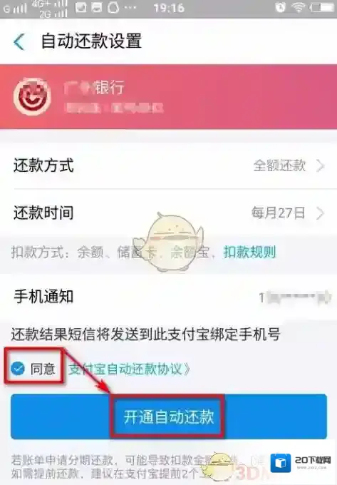 界面弹出“自动还款设置”,选择还款方式、还款时间,然后勾选同意协议,最后点击“开通自动还款”。