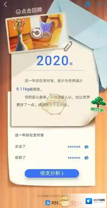 4、最后,还能查看你在支付宝2020年的总收入、总支出。此外,支付宝还体用了收支分析,包括支出笔数、支出分类;以及收入笔数、理财收益等等。