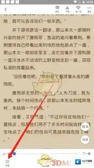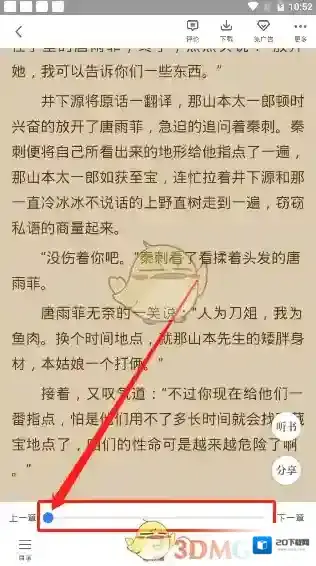 5、在中间还能够看见进度条,上要还有着小球,拖动小球我们可以快速的切换到小说的大概位置,同时也能让用户清楚的知道小说的内容还剩多少。