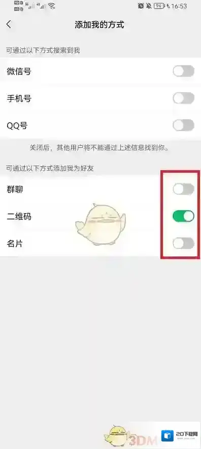 4、最后在此功能界面中,点击打开下方的添加我们的方式,把群聊和二维码、名片都打开,就可以了。