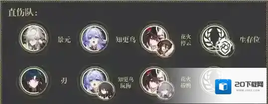 直伤队:姬子+黑塔/翡翠+阮梅/知更鸟+生存位,增益效果:噱头。
