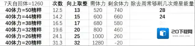 注2:除去周常够刷几次熄星能量的计算方法:[剩余体力-180(龙、狼、公子)]/20