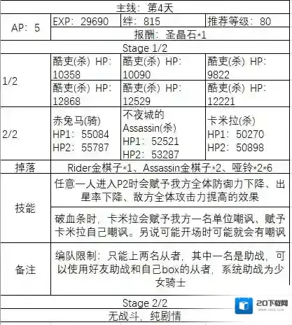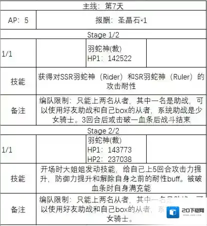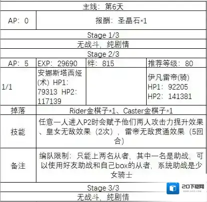 打法推荐:由于敌方为尺阶从者,因此推荐复仇者/狂阶作为主力打手。30w血条的情况下配合BUFF还是比较好击破的。
