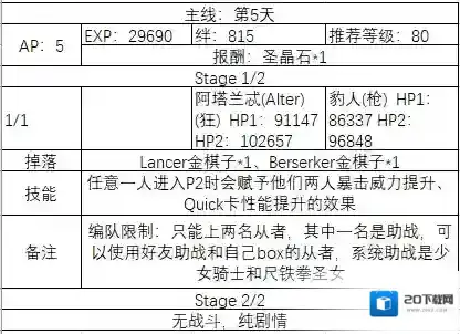 打法推荐:仅能选择一位从者出战,由于队友为枪阶而敌方为两面杀阶小怪和杀阶+骑阶的最终面配置,推荐使用狂阶光炮从者出战,或者术阶光炮配合布拉达曼特击杀。这关敌方血量不高,倍卡从者打起来较为轻松。