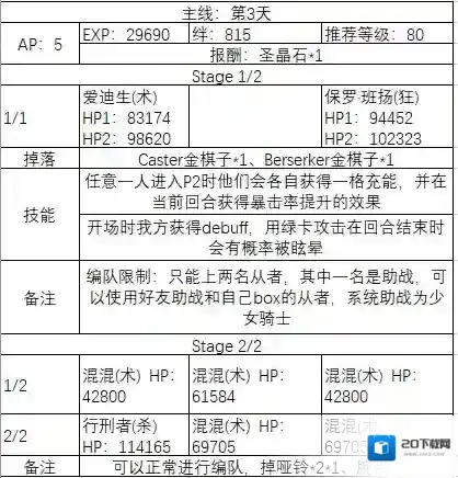 打法推荐:第一战仅能选择一位从者出战,由于队友为枪阶而敌方为术/狂阶,故推荐骑阶从者上场,因为绿卡从者会被眩晕故不推荐绿卡打手。第二战敌方为术阶两面小怪+杀阶11W血大怪,推荐用狂阶光炮,或者骑阶光炮配合术阶单体出战。