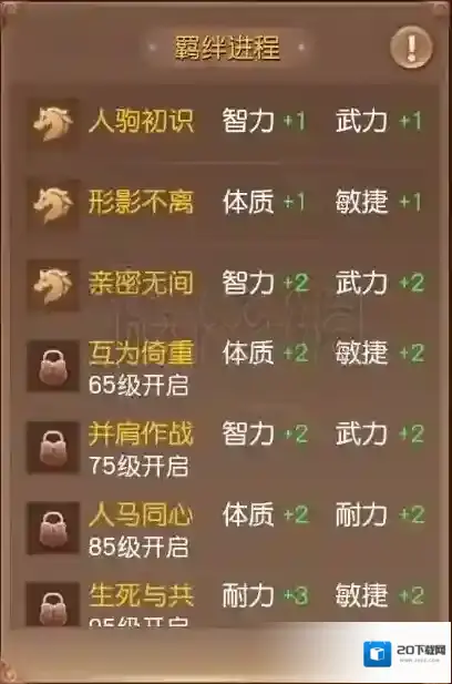 玩家可以在属性分配中为坐骑加点,坐骑每升级1级,会获得10点潜力点,其中5点由系统平均分配到每项一级属性中;另外5点可由玩家自由分配。